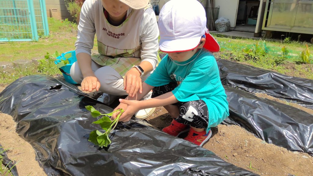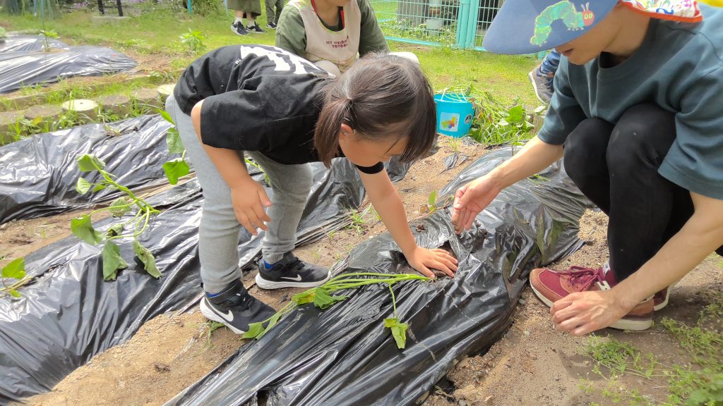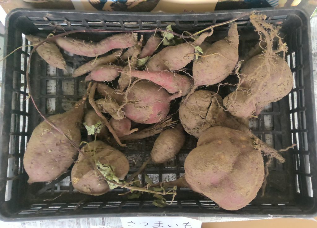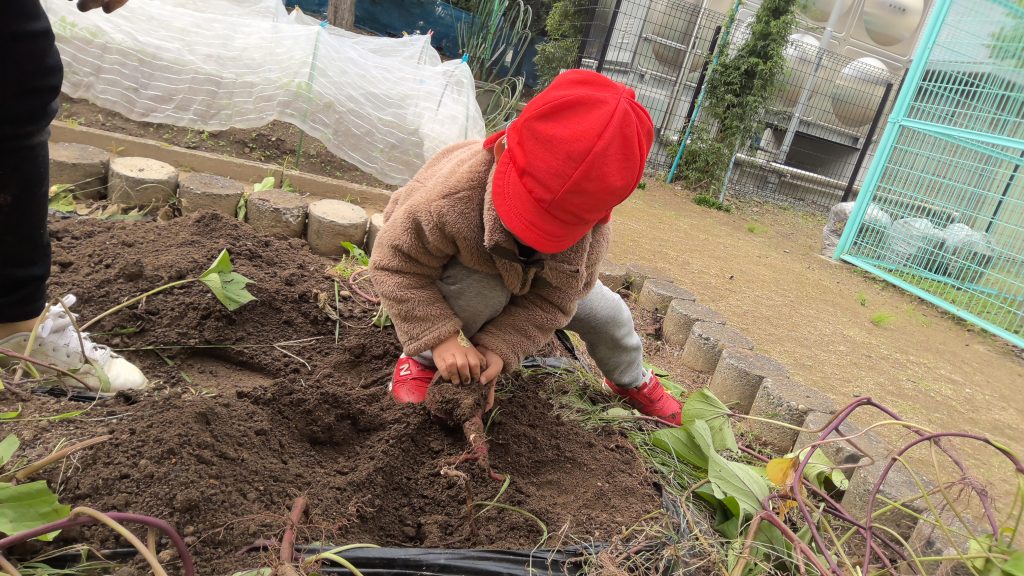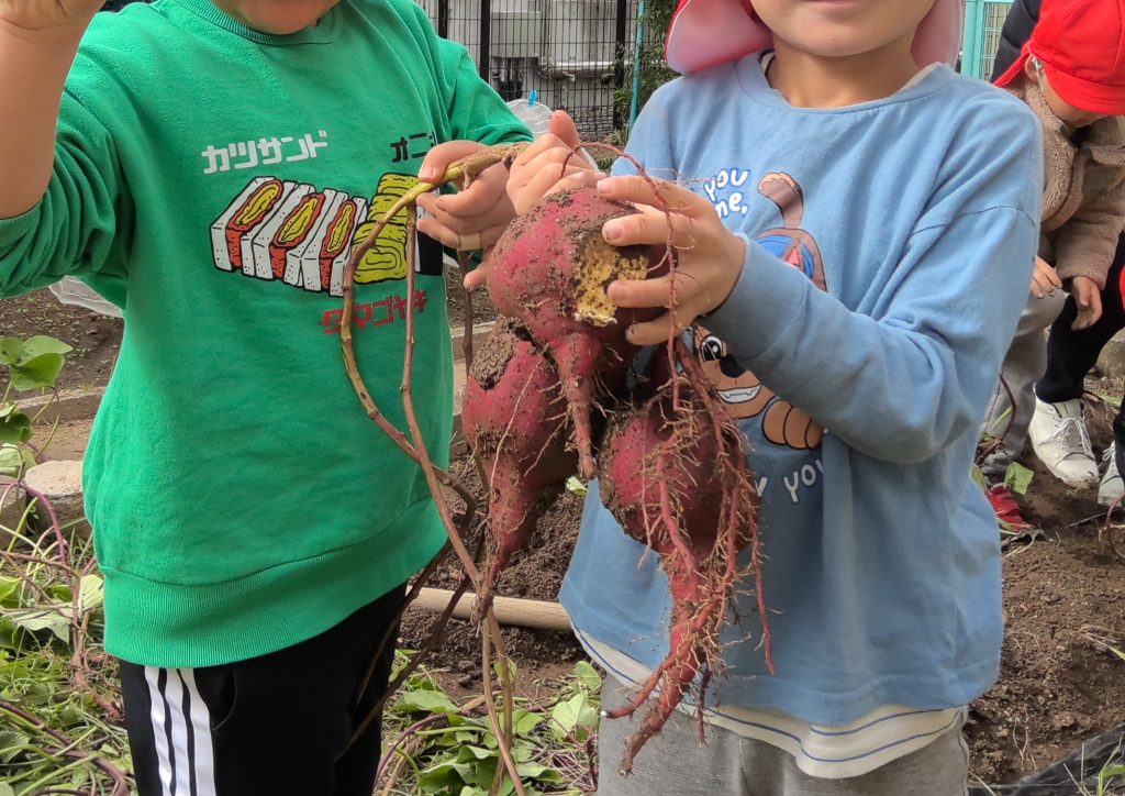 ESDの取り組み/幼稚部の様子 さつまいも 2025年11月27日 5がつに さつまいもの なえさしを したよ。 つるが ぐんぐんのびて つちの なかで おいもが できていたよ。 11がつに いもほりを したよ。 つちを ほったら ちいさな さつまいもや おおきな さつまいもが でてきたよ。 うれしかったよ。 たべるのが たのしみだよ。