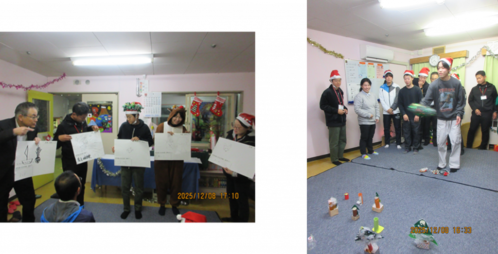 お知らせ/寄宿舎の様子 寄宿舎クリスマス会 2025年12月19日 12月8日(月)に寄宿舎クリスマス会を実施しました。 今年度は新型コロナウイルス感染症まん延以降、久しぶりに学校の先生たちにも参加を呼びかけ、沢山の先生方に参加・参観してもらいました。 リースを使った輪投げ、絵しりとりのゲームに加え、プレゼント交換やクリスマス献立の夕食にデザートのケーキも楽しみました。