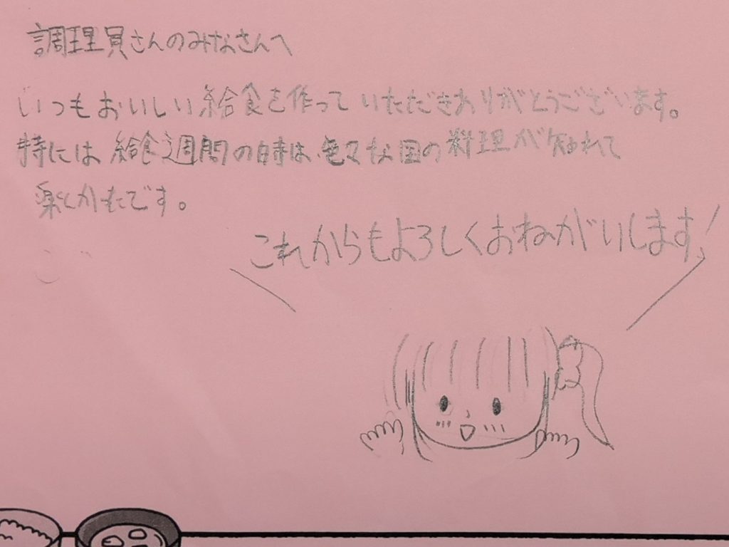 今年度のテーマは「調理員さんに手紙を送ろう! ~ありがとうを伝えよう~」でした。多くの子どもたちが、感謝の手紙を書いてくれました!手紙の一部を紹介します。
