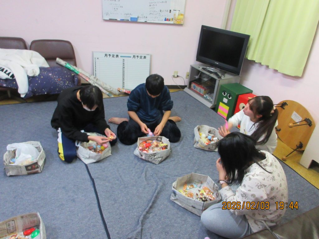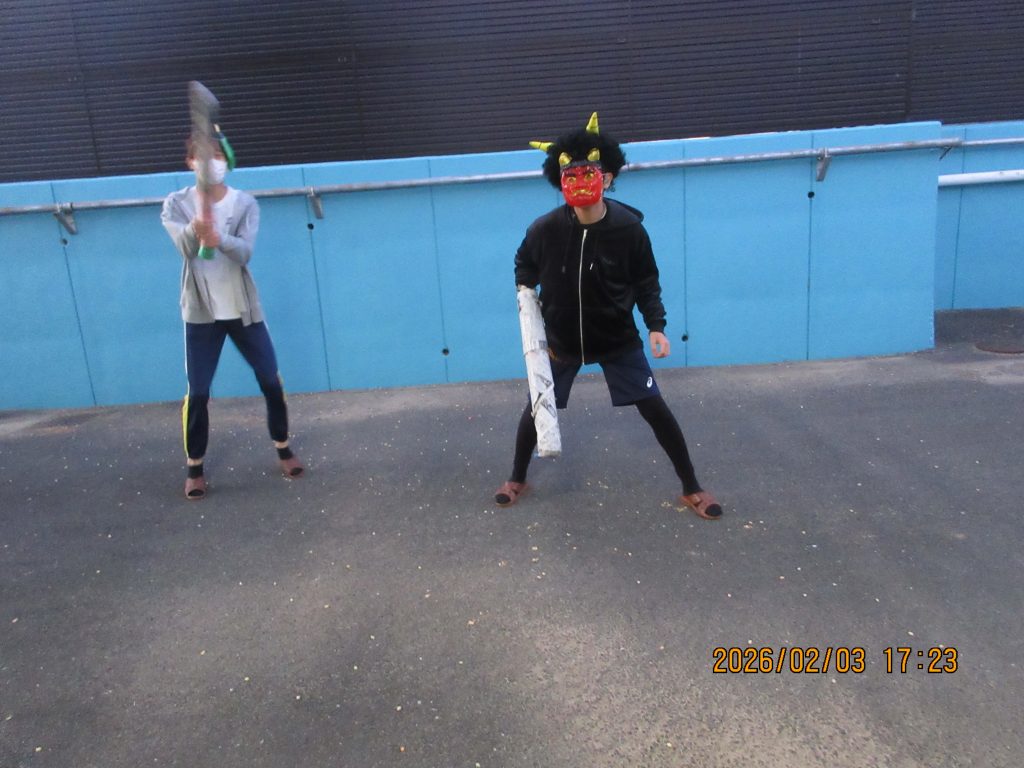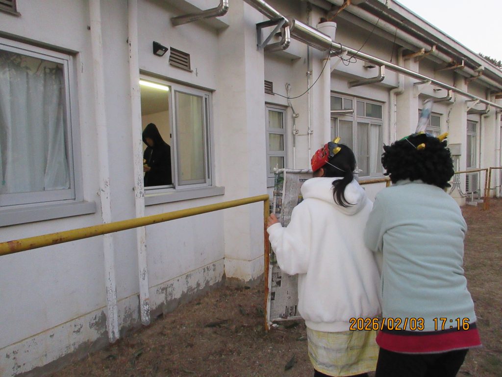 寄宿舎の様子 寄宿舎 豆まき会(2月3日) 2026年2月12日 鬼役は寄宿舎の周りを歩き、他の舎生は「鬼は外!」と言って豆を投げました。 鬼役交代! 迫力満点の鬼役が登場! お菓子まきも楽しみました!