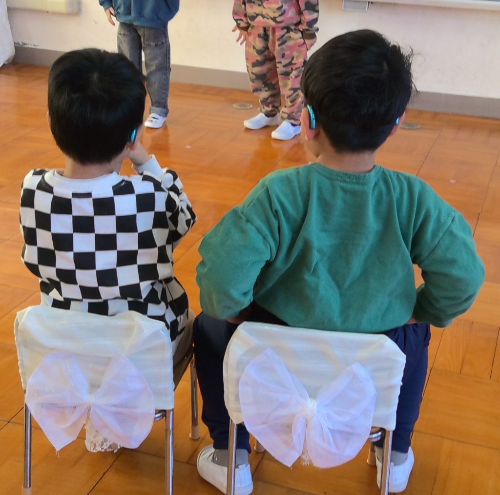 おわかれかいで なかよく すわっていた ぞうぐみの うしろすがたです。おおきくなりましたね。これからも 「どうして?」「なんで?」をたくさん みつけてください。すきなものを いっぱい ふやしてください。ふたりとも もっと もっと おおきくなってくださいね。