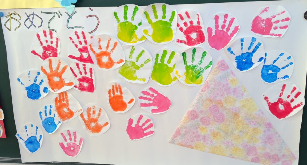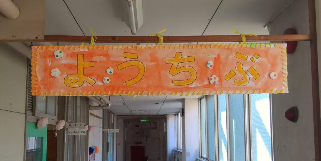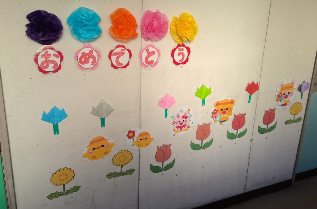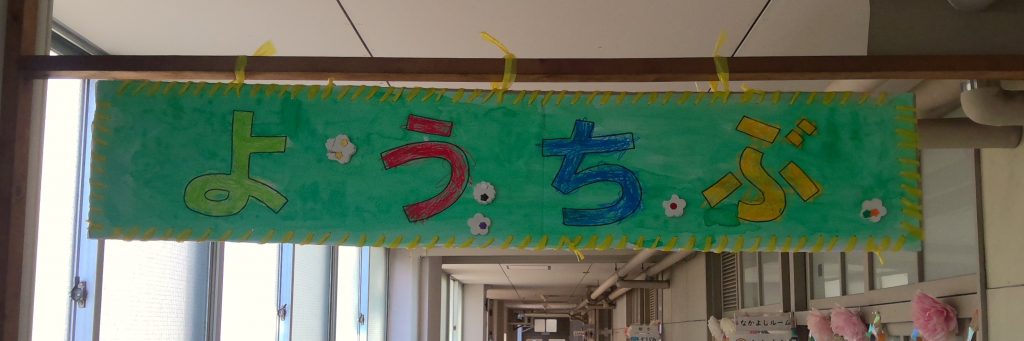 ようちぶの ろうかを ぱんだぐみが かざりました。かざりを えらんだり おはなを つくったりしました。みんなの にがおえも じょうずに かけました。