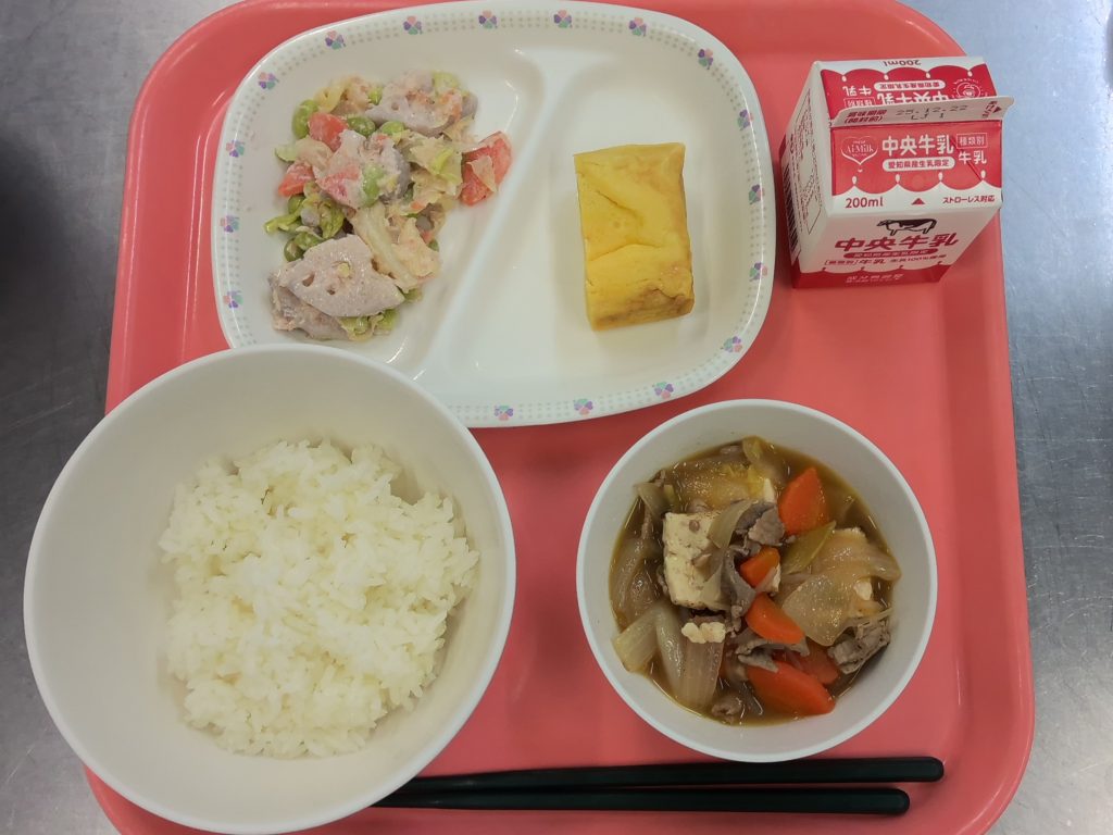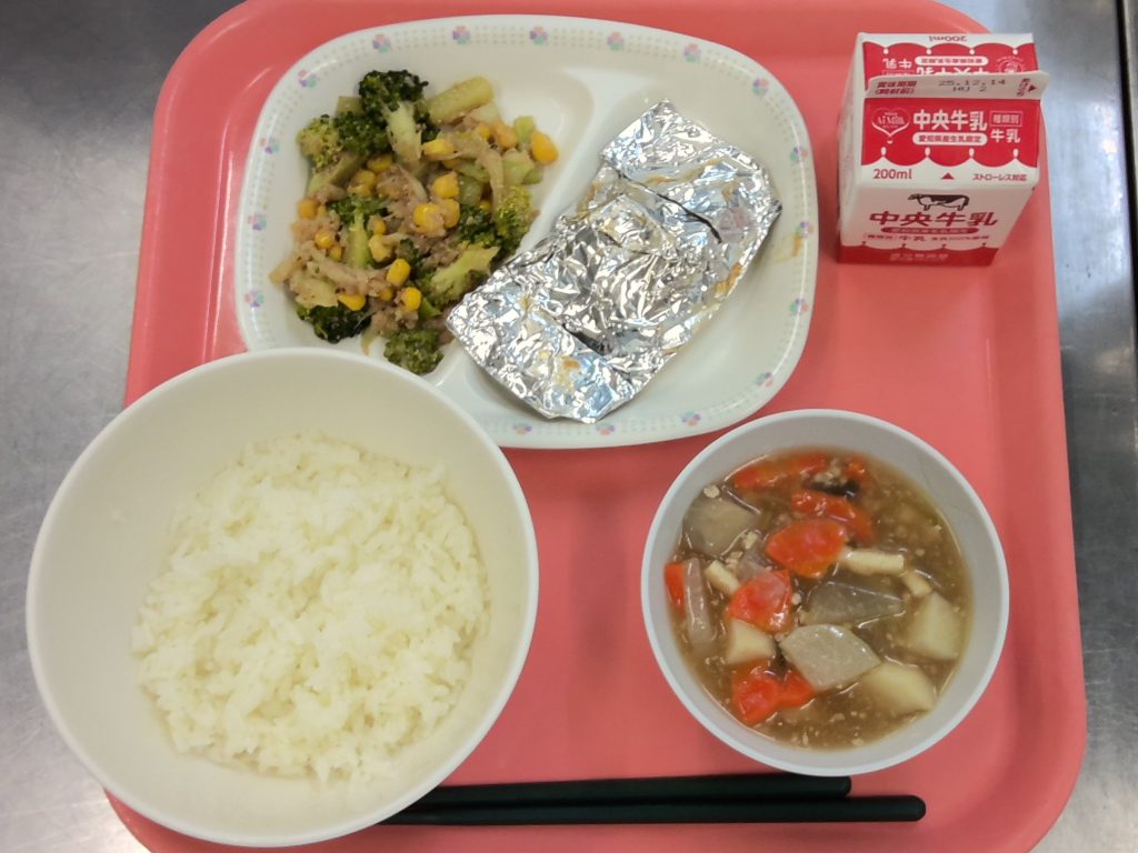 どさんこ汁のたまねぎ、にんじん、じゃがいも、バターは北海道産です!バターを感じると教えてくれた子もいました!